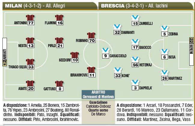FANTACALCIO SERIE A MILAN BRESCIA PROBABILI FORMAZIONI – Questa sera il Milan di Allegri proverà a rispondere alla vittoria della Lazio cercando di ritornare da solo in vetta. A San Siro arriva il Brescia di Iachini. Allegri conferma Robinho accanto a Ibrahimovic, a centrocampo torna Pirlo che prenderà il posto di Ambrosini. Le probabili formazioni secondo il Corriere dello Sport.