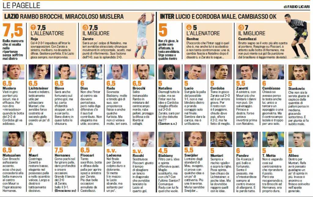 FANTACALCIO SERIE A GAZZETTA LAZIO INTER PAGELLE – All’Olimpico finisce tre a uno per la Lazio che batte l’Inter di Benitez meritatamente. Nei biancocelesti show di Zarate ed Hernanes, nell’Inter si salva solo Castellazzi autore di interventi prodigiosi. Ecco le pagelle della Gazzetta dello Sport.