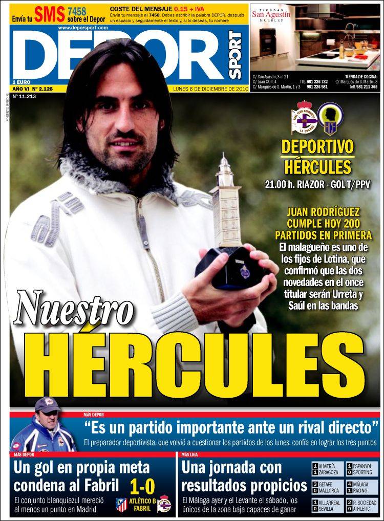 DEPOR SPORT – Sul Depor Sport gioco di parole per presentare il match tra Deportivo ed Hercules e per omaggiare il giocatore del Deport Juan Rodriguez che questa sera toccherà quota 200 presenze con la prima squadra.