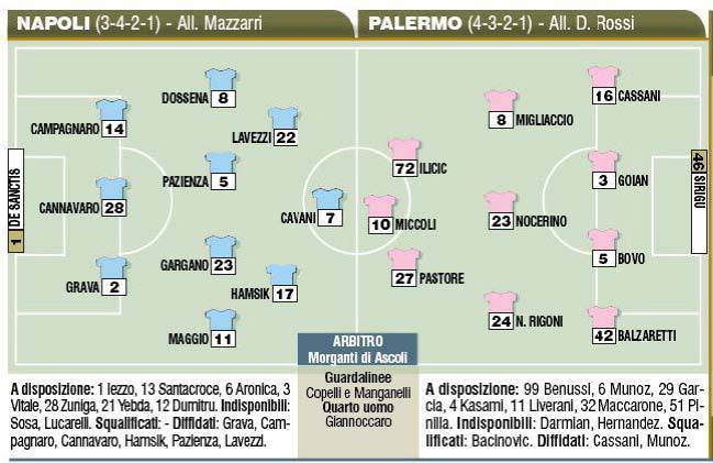 NAPOLI PALERMO PROBABILI FORMAZIONI – Questa sera Monday Night della Serie A con il grande derby del sud tra Napoli e Palermo. E’ il match delle grandi stelle, da una parte Lavezzi, Hamsik e Cavani, dall’altra Pastore, Ilicic e Miccoli. Ecco le probabili formazioni del Corriere dello Sport.