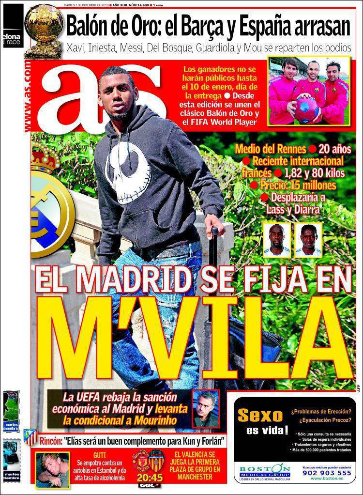 REAL MADRID AS M’VILA – Sul quotidiano spagnolo As si parla del calciomercato del Real Madrid con i madrileni sulle tracce del giovane centrocampista del Rennes M’Vila, 20 anni, che piace molto al tecnico Mourinho.