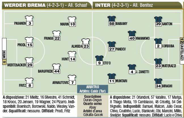 CHAMPIONS LEAGUE WERDER BREMA INTER FORMAZIONI – Questa sera l’Inter giocherà a Brema contro il Werder nell’ultima giornata del girone di Champions League. Nerazzurri già qualificati ma in caso di vittoria ci potrebbero essere speranze per qualificarsi al primo posto. Tutto dipenderà dal Tottenham che se non dovesse vincere contro il Tottenham scivolerebbe al secondo posto. Ecco le probabili formazioni secondo il Corriere dello Sport.