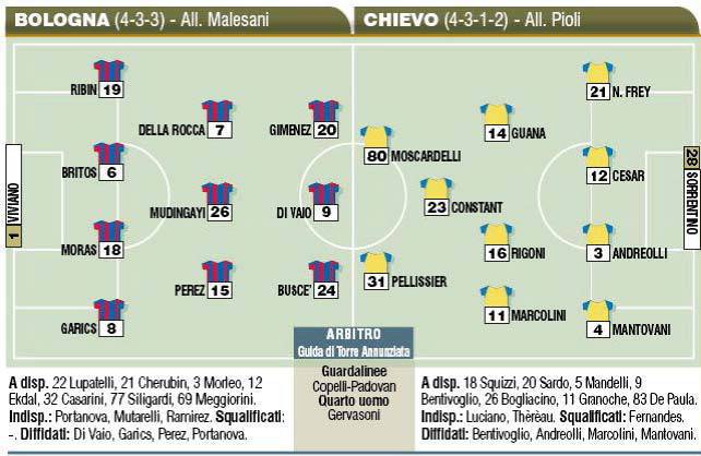 BOLOGNA (4-3-3): Viviano, Rubin, Britos, Moras, Garics, Della Rocca, Mudingayi, Perez, Gimenez Di Vaio, Buscè.