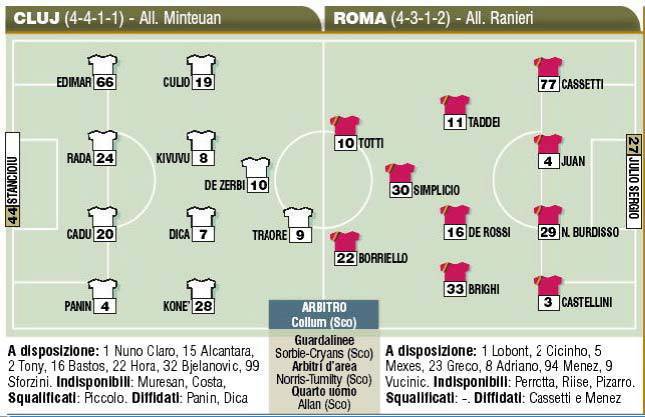 PROBABILI FORMAZIONI ROMA – La Roma va a giocarsi la qualificazione agli ottavi di finale in Romania. Ranieri punta su Totti e Borriello, lasciati a riposo a Verona, e su Simplicio, scatenato in Veneto.