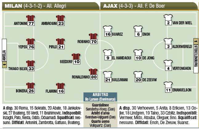 CHAMPIONS LEAGUE MILAN – Il Milan scenderà in campo stasera con l’Ajax di Frank De Boer, neo tecnico olandese. In avanti dovrebbe rivedersi Ronaldinho, turno di riposo perIbrahimovic.