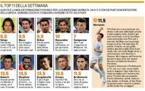 FANTACALCIO TOP 11 – Conferme e new entry nella top 11 Gazzetta dello Sport dell’ultima giornata di campionato. In attacco continuano su alti livelli Ibrahimovic e Quagliarella, mentre Crespo sembra aver ritrovato la vena dei giorni migliori. Largo ai giovani in difesa con Ranocchia e il sorprendente Camporese, ragazzo della Fiorentina di Mihajlovic. Continua il bel momento di Hernanes, mentre Simplicio, dopo le difficoltà di inizio stagione, è diventato un uomo su cui puntare ad occhi chiusi.