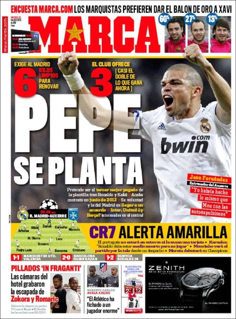 MARCA PEPE REAL MADRID – Sul quotidiano spagnolo Marca si parla del caso Pepe al Real Madrid con il difensore portoghese che per rinnovare vuole sei milioni di euro a stagione mentre la società madrilena è disposta a versarne tre.