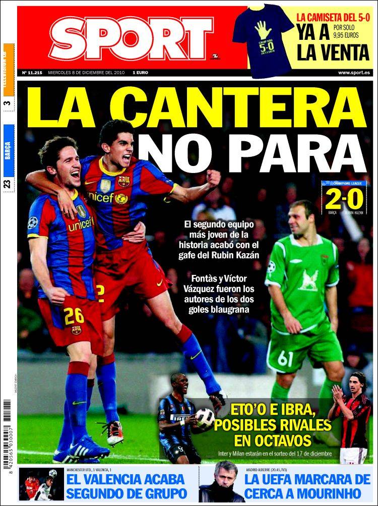 SPORT BARCELLONA CHAMPIONS – Sul quotidiano catalano Sport si parla della vittoria del Barcellona contro il Rubin Kazan nell’ultima giornata dei gironi di Champions League con i gol di due giovani della cantera, Fontas e Victor Vasquez.