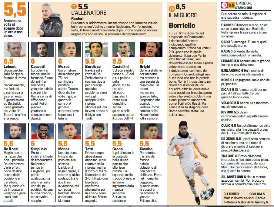 CHAMPIONS LEAGUE ROMA CLUJ PAGELLE – La Roma di Ranieri pareggia uno a uno contro i romeni del Cluj grazie al gol del solito Borriello, migliore in campo secondo la Gazzetta dello Sport. Troppo nervoso il capitano Totti, ecco tutti gli altri voti.