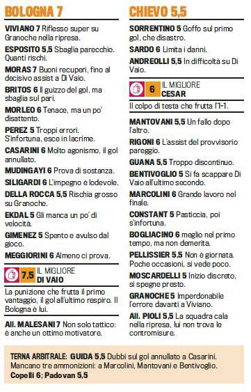 FANTACALCIO SERIE A BOLOGNA CHIEVO PAGELLE – Nel recupero della 14a giornata di Serie A, il match tra Bologna e Chievo finisce due a uno per i felsinei con i gol di Britos e Di Vaio intervallato dal pareggio di Cesar. Ecco le pagelle della Gazzetta dello Sport.