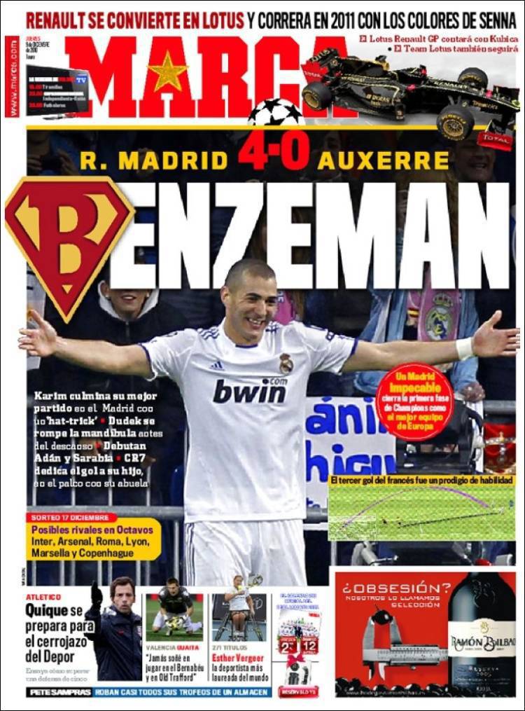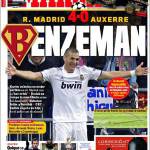 MARCA BENZEMA REAL MADRID – Sul quotidiano Marca si parla della vittoria del Real Madrid sull’Auxerre per quattro a zero con tripletta di Karim Benzema e gol di Cristiano Ronaldo. Auxerre scavalcato dall’Ajax, fuori anche dall’Europa League.