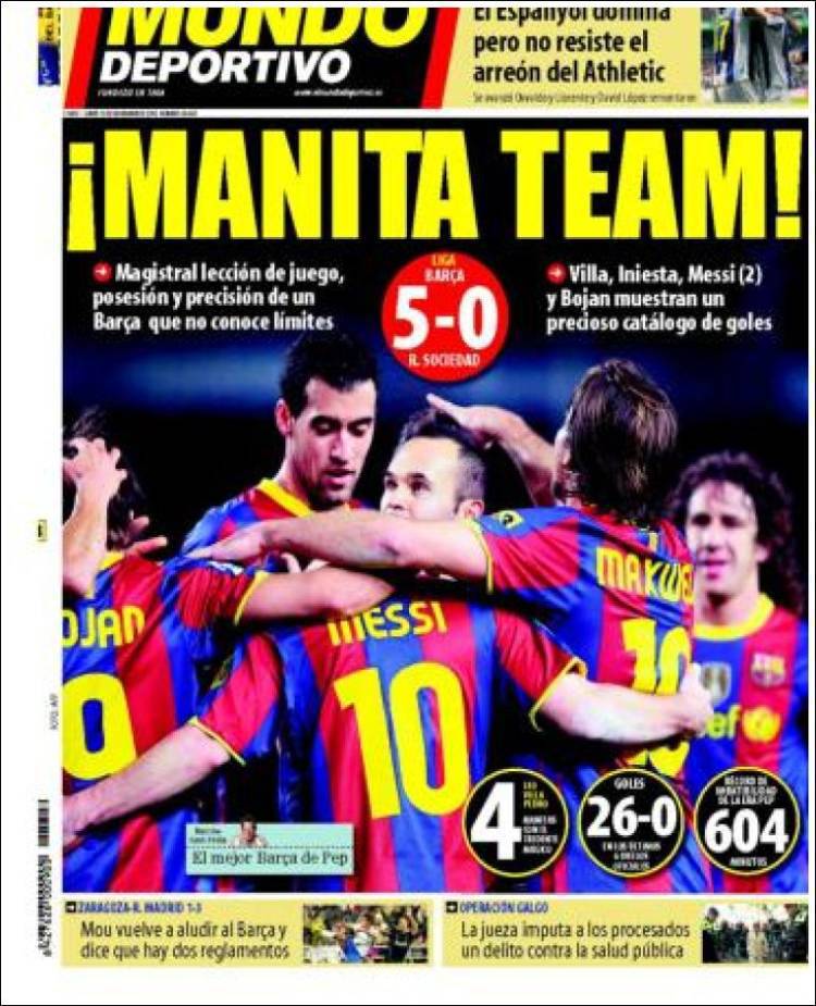 MUNDO DEPORTIVO BARCELLONA – La vittoria casalinga del Barcellona contro il Real Sociedad con il punteggio di cinque a zero riporta alla menta del Mundo Deportivo la vittoria contro il Real Madrid sempre con lo stesso punteggio. Un’altra manita costruita da Messi e soci.