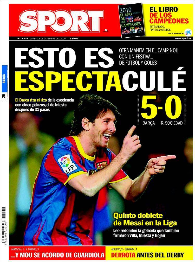 SPORT BARCELLONA MESSI – Il quotidiano catalano Sport parla di spettacolo Barcellona che vince cinque a zero contro la Real Sociedad con doppietta di uno stratosferico Lionel Messi. Un’altra manita preparata dai catalani.