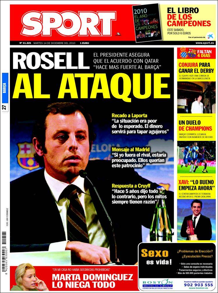 SPORT ROSELL BARCELLONA – Sull’altro quotidiano catalano Sport spazio alle dichiarazioni del presidente del Barcellona Sandro Rosell che ha risposto a coloro che criticavano l’accordo con la società Qatar Foundation che sarà il primo sponso della storia del club catalano.