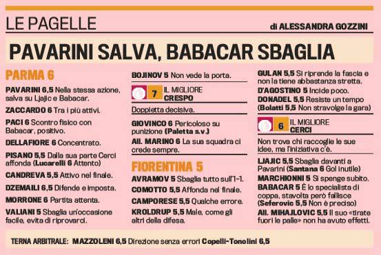 GAZZETTA PAGELLE PARMA FIORENTINA – Il Parma si qualifica per i quarti di finale di Coppa Italia dopo aver battuto la Fiorentina al Tardini per due a uno. Succede tutto nei supplementari con il vantaggio dei toscani con Santana che anticipa la doppietta decisiva di Crespo, migliore in campo. Ecco i voti della Gazzetta dello Sport.