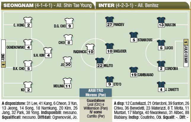 SEONGNAM INTER PROBABILI FORMAZIONI FOTO – L’Inter di Benitez debutterà questa sera alle ore 21 ad Abu Dhabi (le 18 in Italia) contro il Seongnam nella semifinale del Mondiale per Club. I nerazzurri recuperano Julio Cesar, Maicon e Milito e si schiereranno con il 4-2-3-1. Ecco le probabili formazioni secondo il Corriere dello Sport.