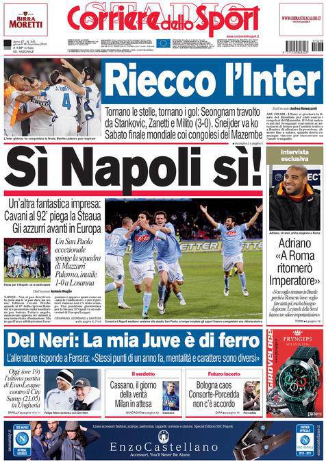 CORRIERE NAPOLI – Il Corriere dello Sport parla invece della vittoria del Napoli contro lo Steaua Bucarest con un gol di Cavani a tempo scaduto che permette ai partenopei di qualificarsi per il turno successivo di Europa League.