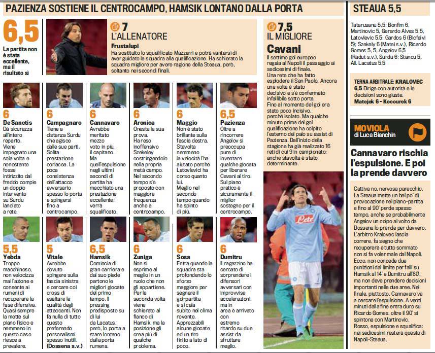 VOTI GAZZETTA NAPOLI STEAUA PAGELLE – Il Napoli di Mazzarri si qualifica al turno successivo di Europa League dopo aver battuto lo Steaua Bucarest uno a zero con il gol di Cavani nel recupero. Per la Gazzetta dello Sport l’uruguagio è stato il migliore in campo. Ecco le pagelle.