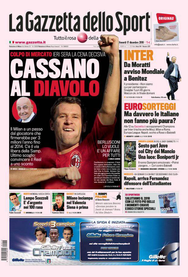 GAZZETTA CASSANO – Sulla Gazzetta dello Sport si parla del futuro di Antonio Cassano che è a un passo dal Milan. Il giocatore si legherà alla società rossonera fino al 2014 e guadagnerà 3 milioni di euro a stagione.