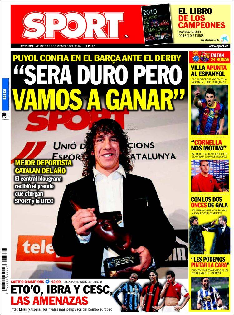 SPORT PUYOL BARCELLONA – Sul quotidiano catalano Sport si parla del derby catalano tra Espanyol e Barcellona con il capitano dei blaugrana Puyol che carica i suoi compagni.
