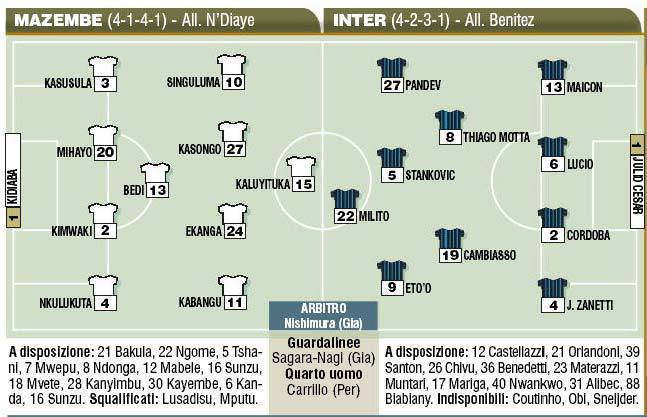 FINALE MONDIALE PER CLUB MAZEMBE INTER FORMAZIONI – Questa sera ad Abu Dhabi alle ore 21 (le 18 in Italia) l’Inter di Benitez affronterà il Mazembe nella finale del Mondiale per Club. I congolesi hanno dimostrato di essere una squadra rocciosa dal punto di vista fisico, per questo Benitez ha chiesto massima concentrazione ai suoi. L’Inter recupera Maicon ma perde Sneijder, al suo posto giocherà Stanjkovic trequartista e Thiago Motta a centrocampo con Cambiasso. Ecco le formazioni secondo il Corriere dello Sport.