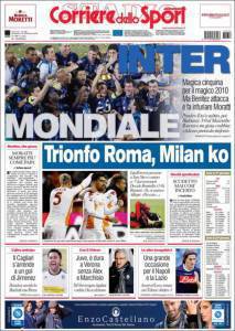 CORRIERE DELLO SPORT INTER MONDIALE / Il Corriere dello Sport si focalizza quest’oggi sulla bella e convincente vittoria dell’Inter nel Mondiale per Club. La vittoria in finale contro i Congolesi del Mazembe è valsa il titolo iridato e capitan Zanetti può sollevare così il quinto trofeo del 2010. In basso riferimento alla bella vittoria della Roma che, grazie all’ex Marco Borriello, ferma la capolista Milan nell’ultima partita dell’anno