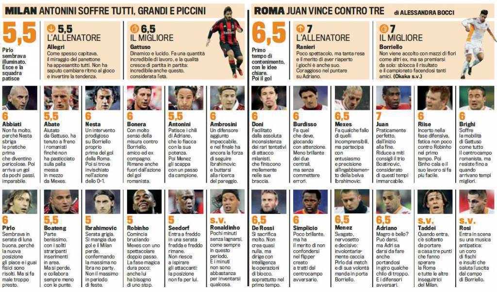 FANTACALCIO MILAN ROMA / Ecco i voti pubblicati questa mattina dalla Gazzetta dello Sport per la partita Milan-Roma. Migliore in campo ovviamente è Marco Borriello, l’ex decide la partita con un gol e ferma la corsa dei rossoneri. Delude invece Ibrahimovic che prende un 5, sarà l’aria natalizia ad averlo fermato?