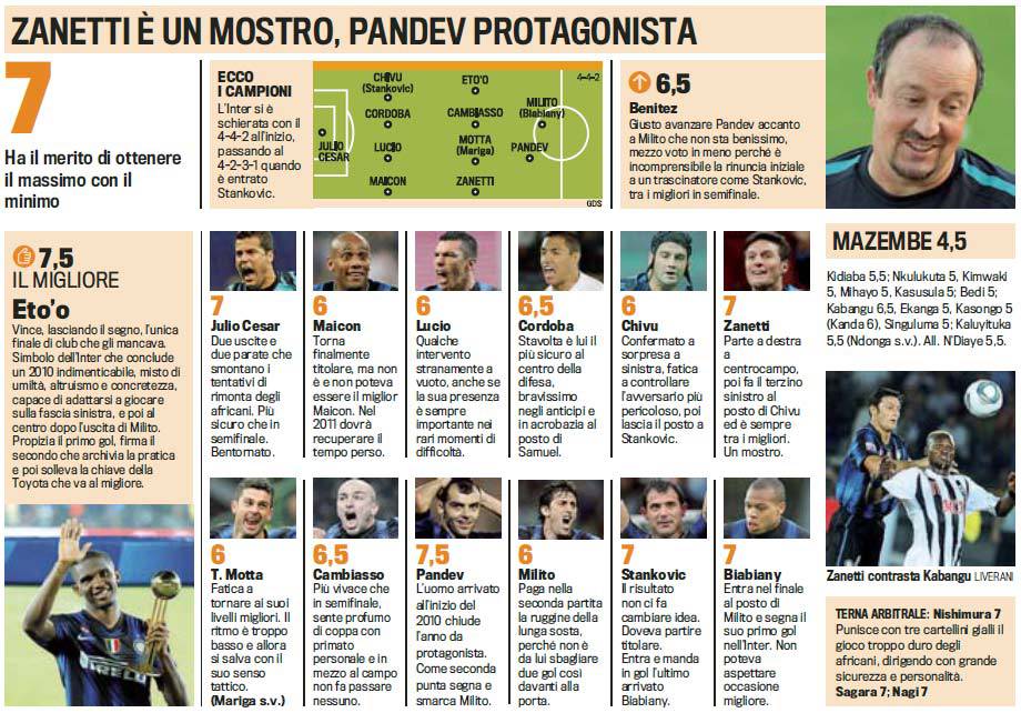INTER MAZEMBE VOTI GAZZETTA / Ecco i voti della Gazzetta per il trionfo dell’Inter nel mondiale per club. Vittoria per 3-0 e trofeo di migliore in campo che va sicuramente a Samuel Eto’o che chiude un 2010 da protagonista. Squadra da premiare per il carattere e la voglia di vincere un trofeo che mancava da anni nella bacheca nerazzurra.