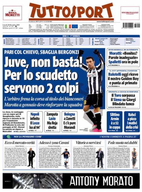 TUTTOSPORT JUVENTUS SCUDETTO – Sul quotidiano torinese Tuttosport si parla del pareggio della Juventus in casa del Chievo. I bianconeri si sono fatti raggiungere all’ultimo minuto dal gol di Pellissier.
