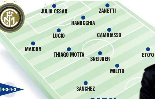CALCIOMERCATO INTER LEONARDO FORMAZIONE – Il divorzio ufficiale tra l’Inter e Benitez e l’arrivo di Leonardo potrebbero cambiare i movimenti di mercato del club nerazzurro. Il brasiliano ha chiesto al presidente Moratti di portare subito a Milano Andrea Ranocchia, centrale difensivo del Genoa in comproprietà tra le due società. L’altro acquisto che avrebbe chiesto l’ex allenatore rossonero è Sanchez dell’Udinese, anche se il patron Pozzo difficilmente lascerà partire il giocatore già a gennaio e comunque per rilevare il cartellino occorrerà sborsare circa 20 milioni di euro. Oggi il quotidiano torinese Tuttosport ha riportato l’undici ideale pensata da Leonardo, schierata con il modulo 4-2-1-3, ovvero lo stesso schema tattico usato lo scorso anno al Milan. Ecco la foto.