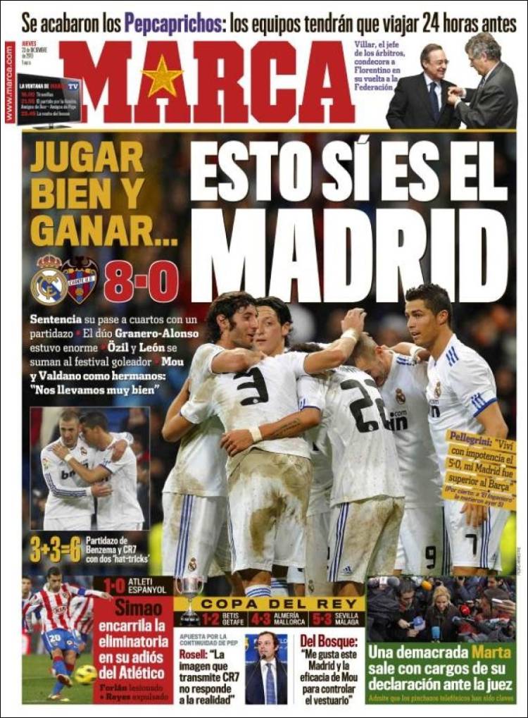 MARCA REAL MADRID – Sul quotidiano spagnolo Marca si celebra l’otto a zero del Real Madrid sul Levante in Coppa del Re con le triplette di Benzema e Cristiano Ronaldo e i gol di Ozil e Pedro Leon.