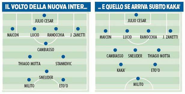 CALCIOMERCATO INTER LEONARDO KAKA’ – Il calciomercato dell’Inter ieri ha messo fine all’era Benitez. Il tecnico spagnolo ha trovato l’accordo con l’Inter per la risoluzione del contratto ponendo fine a un rapporto mai sbocciato con il presidente Moratti. Il nuovo allenatore sarà quasi certamente Leonardo, l’ex tecnico del Milan ha già in mente come far giocare la sua nuova squadra. Oggi il Corriere dello Sport ha riportato due possibili formazioni dell’Inter, in entrambe c’è Ranocchia, difensore che i nerazzurri dovrebbero prelevare dal Genoa. C’è poi il sogno Kakà, il brasiliano potrebbe arrivare, con lui l’Inter adotterebbe un 4-3-2-1 con lui ed Eto’o dietro a Milito (Sneijder a centrocampo), senza l’ex rossonero 4-3-1-2 con Sneijder nel ruolo di trequartista.