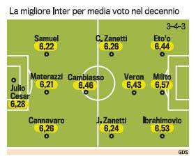 CALCIOMERCATO INTER LEONARDO SQUADRE DEL DECENNIO FOTO – La Gazzetta di dieci anni fa era in bianco e nero ma, come oggi, parlava dell’Inter. Titolo in prima pagina, 29 dicembre 2000: «L’Inter stringe i tempi per Materazzi e Georgatos. Preso Pacheco» . Georgatos, terzino sinistro greco, e Antonio Pacheco, attaccante del Penarol visto una sola volta in A: rinforzi da periodo buio, da crisi dell’impero. Perché l’Inter dieci anni fa era una squadra in rottura prolungata, con il miraggio dello scudetto. A Moratti, quindi, farà piacere sapere che da allora è stato semplicemente il migliore. Poborsky, Moggi e Mou L’Inter nel decennio 2001-2010 ha fatto 747 punti in Serie A: 217 vittorie, 96 pareggi e 54 sconfitte, con un super 2007 da 92 punti. Meglio di Milan, Juventus, Roma, Lazio e Udinese, anche perché la Juventus non può considerare il 2006-07, la stagione della B. In dieci anni, certo, è successo un po’ di tutto. Intanto, l’Inter ha segnato 666 gol (ma la squadra del diavolo non era il Milan?) e ne ha subiti 350. Poi, ha vissuto colpi di scena e ribaltoni. Su tutti, tre: il 5 maggio 2002 con lo scudetto perso a Roma, lo scandalo del 2006 con il cambio nelle gerarchie del campionato e l’arrivo di Mourinho nel 2008. Il Milan in dieci anni ha vinto due Champions, la Roma ha rimesso le mani sullo scudetto, ma solo la Juve ha avuto alti e bassi paragonabili. Ivan, che carattere Due giocatori possono raccontarli tutti: Javier Zanetti e Cordoba sono gli unici ad aver vissuto l’intero decennio da interisti. Non a caso, i record di durata sono monopolizzati dal duo-Sudamerica. Nella classifica per presenze nerazzurre dal 2001 al 2010, Zanetti è primo con 344, Cordoba secondo con 277. Impressionante, anche perché Zanetti ha messo in fila una striscia di 99 sufficienze nelle pagelle Gazzetta, statistica che resta vagamente irreale. Stessi protagonisti se si contano i minuti giocati: Zanetti primo a 30.201, Cordoba secondo a 23.159 e primissimo nei cartellini. I tifosi della curva lo chiamano Café Colombia ma la caffeina rende nervosi: in dieci anni ha preso 66 ammonizioni e 5 espulsioni, un giallo e mezzo al mese contando anche l’estate e le vacanze di Natale. Materazzi, in confronto, è un dilettante: 53 cartellini in nove anni e mezzo. Milito sempre 6,5 I numeri che contano davvero però sono altri. Intanto, i punti: l’Inter ha vinto la classifica dell’anno solare dal 2006 al 2009. Poi, i gol: il capocannoniere del decennio interista è Vieri con 89 reti. Alla fine, i voti: Ronaldo ha avuto una media pazzesca (6,81) ma ha preso voto solo 8 volte. Poche. Tra chi è comparso almeno 30 volte nelle pagelle, quindi, il migliore è Milito con 6,57, poi Ibra, Cambiasso ed Eto’o, che chiude il cerchio aperto con Ronaldo. Due fenomeni, all’inizio e alla fine del decennio. E qui, la domanda: come sarà l’Inter nel 2020? Georgatos e Pacheco hanno smesso e non dovrebbero tornare sulla scena. Piuttosto, il capocannoniere del 2010 è stato Leo Messi. Per il tifoso, se c’è da immaginare, tanto vale immaginare bene.