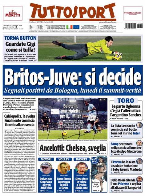 TUTTOSPORT JUVENTUS BRITOS – Sul quotidiano torinese Tuttosport si parla del possibile acquisto del difensore uruguagio Britos da parte della Juventus.