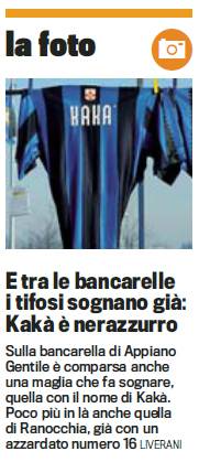 CALCIOMERCATO INTER KAKA’ – L’arrivo di Leonardo in panchina ha ridato entusiasmo ai tifosi dell’Inter e anche al presidente Massimo Moratti che ieri durante la presentazione del nuovo tecnico nerazzurro ha aperto a nuovi possibili acquisti sul mercato invernale. I tifosi sognano un altro sgarbo ai cugini rossoneri per questo hanno chiesto a gran voce l’acquisto di Ricardo Kakà, anche se proprio ieri lo stesso Leonardo ha dichiarato che il brasiliano non si muoverà da Madrid. Ad Appiano Gentile però hanno già preparato la maglia nerazzurra di Kakà, solo il nome, senza numero, la scaramanzia è d’obbligo. Ora tocca al presidente Moratti completare il mosaico. Ecco la foto della Gazzetta dello Sport.