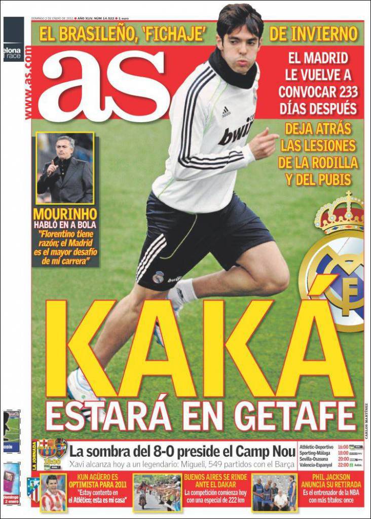 AS KAKA’ GETAFE / Il quotidiano Spagnolo AS apre con una foto notizia riguardante Ricardo Kakà.Il giocatore del Real Madrid infatti si sta riprendendo definitivamente dall’infortunio e finalmente sarà in campo con il Getafe. La foto infatti ritrae Kakà in allenamento pronto per recuperare per la prima partita del nuovo anno.