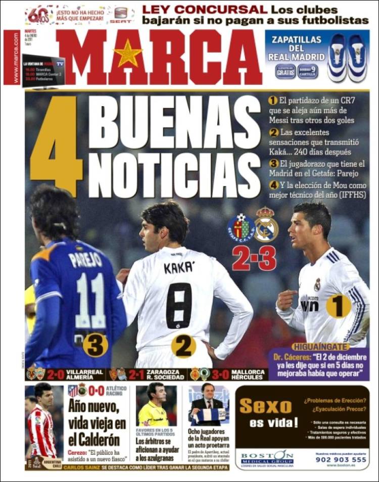 MARCA REAL MADRID LIGA – Sul quotidiano spagnolo Marca si parla della vittoria del Real Madrid sul campo del Getafe per tre a due. Buone sensazioni per il ritorno in campo di Kakà.