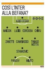 INTER NAPOLI PROBABILE FORMAZIONE LEONARDO – La prima Inter di Leonardo: non è ancora detto che sia anche la prima che metterà in campo, giovedì sera contro il Napoli, però non era ancora successo che il tecnico la provasse in una partitella, andata in onda ieri. «Non c’è nulla da inventare» , aveva detto al suo primo giorno nerazzurro Leo. Dunque con Stankovic trequartista e Pandev al fianco di Milito, in attesa del ritorno di Sneijder (e Coutinho) e, dopo la squalifica, di Eto’o. La scommessa di Eto’o Samu ieri è tornato ad allenarsi per la prima volta, ha chiacchierato a lungo con il nuovo allenatore e sul sito camfoot. com ha rilanciato la sfida al Milan: «Mi auguro di tornare a Milano per vincere questo scudetto. E’ una sfida personale, una scommessa importante: voglio divertirmi e strappare la vittoria al Milan» . Julio Cesar ci prova Scegliendo il 4-3-1-2, a Leonardo resterebbe solo un dubbio: lanciare subito Ranocchia al fianco di Lucio, oppure confermare Cordoba, sempre positivo al posto di Samuel. L’altra incognita riguarda Julio Cesar: ieri il portiere aveva meno fastidio al bicipite femorale sinistro, ma sono progressi da riverificare prima di poter assicurare la propria presenza. In base al test di ieri, invece, non dovrebbe esserci il dubbio Stankovic, che domenica non si era allenato perché influenzato: se il serbo non dovesse dare garanzie totali, Leonardo potrebbe virare sul 4-3-3, con Biabiany e Pandev larghi e Milito centravanti.