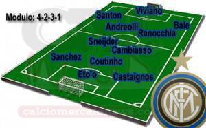 CENTROCAMPO: La linea mediana verrà affidata a Cambiasso, ormai fisso nel ruolo di centrocampista difensivo; in coppia con l’argentino Sneijder, sul quale Leonardo vuole puntare, sperando che riacquisti lo smacco di un tempo. Nel ruolo di trequartisti, il tecnico brasiliano ha in mente grandi cose, con un trio di giovanissimi talenti. Partiamo da Coutinho, il diciottenne brasiliano, che fino a questo punto della stagione non si è rivelato mai decisivo, vedrà aumentare l’importanza della sua posizione all’interno della squadra ricoprendo un ruolo di primaria considerazione. Al suo fianco sulla destra vedremo Sanchez, il talento cileno dell’Udinese, che il presidente friulano lascerà andare a giugno; fascia sinistra per il talento olandese Luc Castaignos del Feyenoord, classe 1992, come Coutinho.