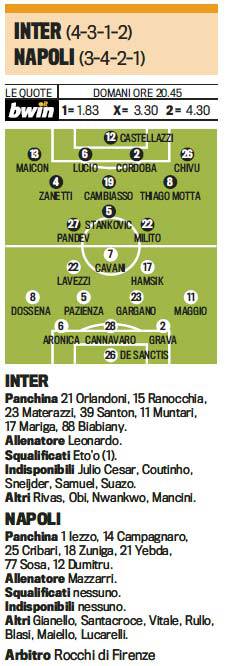 FANTACALCIO SERIE A INTER NAPOLI FORMAZIONI – Domani torna il campionato e il pezzo forte è in serata nel match tra Inter e Napoli. Tra i nerazzurri non è sicuro il debutto dal primo minuto di Ranocchia, deciderà il nuovo tecnico Leonardo. Nel Napoli torna a disposizione Lavezzi. Ecco le formazioni della Gazzetta dello Sport.