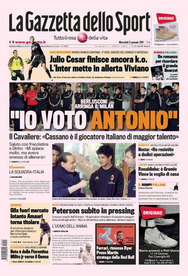 GAZZETTA BERLUSCONI MILAN – Sulla Gazzetta dello Sport si parla della visita di Berlusconi al raduno del Milan con il presidente rossonero che ha fatto i complimenti a Cassano.