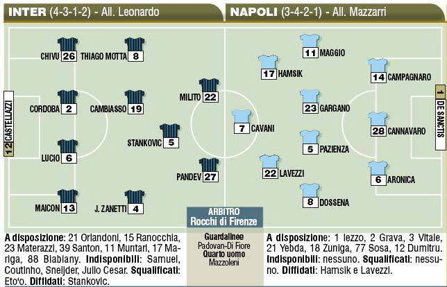FANTACALCIO SERIE A INTER NAPOLI FORMAZIONI – Questa sera grande big match a San Siro tra Inter e Napoli. Il tecnico nerazzurro Leonardo si affida alla vecchie guardia, Mazzarri al rientro di Lavezzi. Ecco le formazioni del Corriere dello Sport.