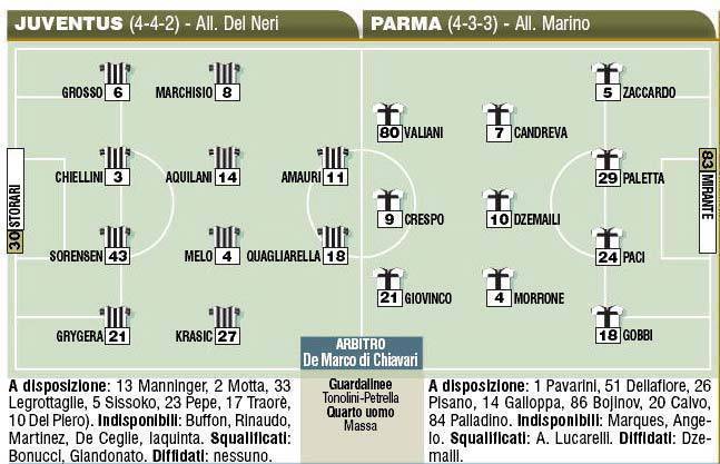 FANTACALCIO SERIE A JUVENTUS PARMA PROBABILI FORMAZIONI – Juventus-Parma è l’anticipo a mezzogiorno del campionato di Serie A. I bianconeri propongono la coppia Amauri-Quagliarella in attacco mentre in difesa la novità è Sorensen. Il Parma punta su Crespo e l’ex Giovinco.