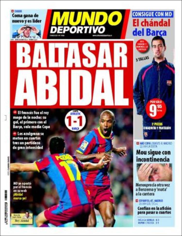 MUNDO DEPORTIVO ABIDAL BARCELLONA – Sul quotidiano catalano Mundo Deportivo si parla dell’uno a uno in Coppa del Re del Barcellona contro l’Atletico Bilbao, pareggio ottenuto grazie al gol di Abidal.