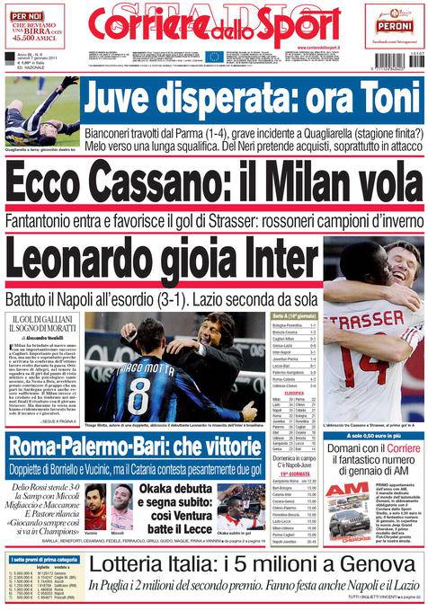 CORRIERE DELLO SPORT PRIMA PAGINA RASSEGNA STAMPA – Il quotidiano romano dedica la prima pagina alla bella vittoria del Milan trovata con l’aiuto di Antonio Cassano. Spazio anche all’esordio molto positivo di Leonardo contro il Napoli nonchè al mercato e all’operazione Juventus-Toni