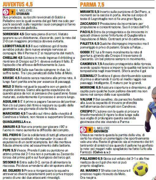 FANTACALCIO SERIE A PAGELLE GAZZETTA JUVENTUS PARMA- Nell’anticipo delle 12,30 di ieri, perso dalla Juventus per 4 a 1 contro il Parma, sono solo 3, secondo le pagelle della Gazzetta dello Sport, i bianconeri ad aver fornito una prestazione sufficiente: il migliore della Juve, Storari, Del Piero e Sissoko. Il primo ha infatti ottenuto un 7, merito delle tante parate effettuate, gli altri due hanno invece un 6. Tra i ducali, il migliore è stato Giovinco, autore di una doppietta che gli è valsa un 8 in pagella. Come molti ricorderanno, Giovinco è stato ceduto al Parma proprio dalla Juventus, e per questo non ha esultato durante la partita, ma solo negli spogliatoi.
