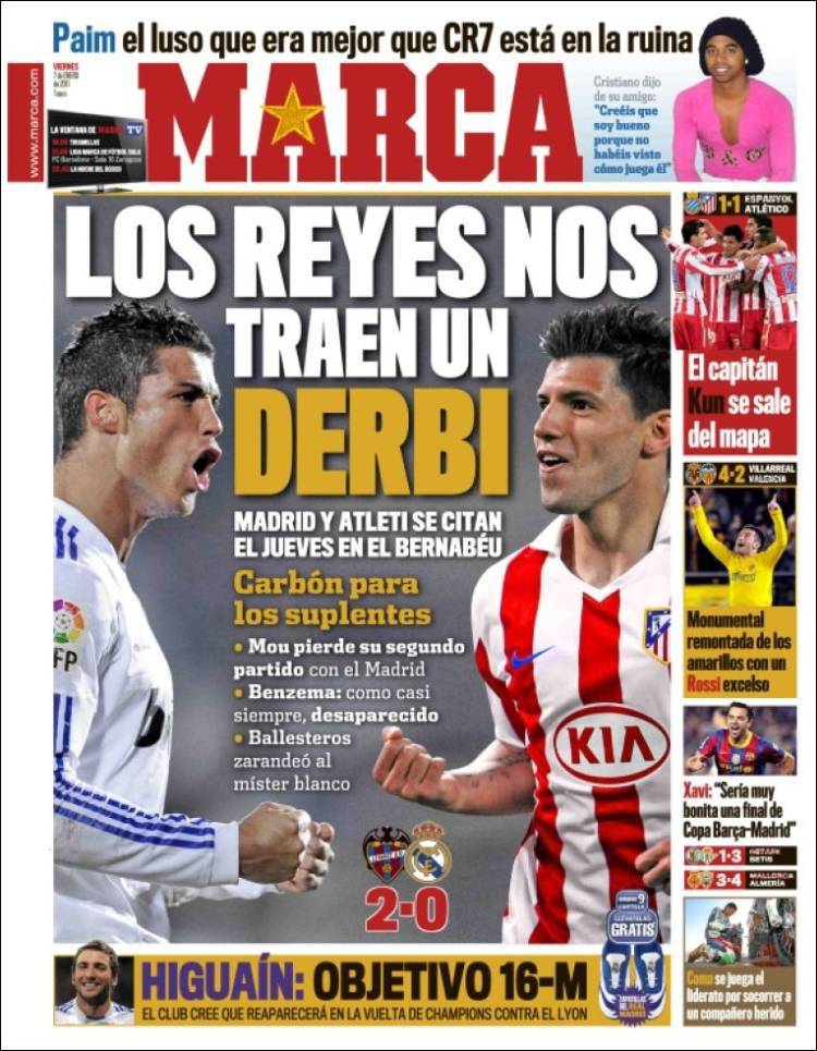 MARCA PRIMA PAGINA RASSEGNA STAMPA – Il quotidiano spagnolo Marca apre dedicando la notizia alla prossima sfida caldissima della Liga, il derby di Madrid in cui probabili protagonisti saranno Cristiano Ronaldo e il Kun Aguero.