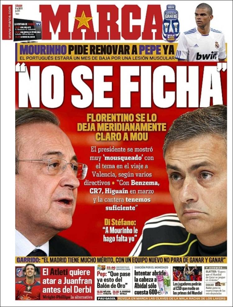 MARCA PEREZ MOURINHO – Sul quotidiano spagnolo Marca viene riportato il pensiero del presidente del Real Madrid Florentino Perez che ha mandato un messaggio a Mourinho dichiarando che non acquisterà nessun attaccante a gennaio.