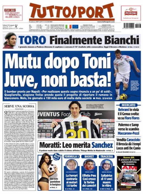 TUTTOSPORT MUTU TONI JUVENTUS – Sul quotidiano torinese Tuttosport si parla del calciomercato Juventus che dopo l’acquisto di Toni potrebbe acquistare anche Adrian Mutu, centravanti della Fiorentina.