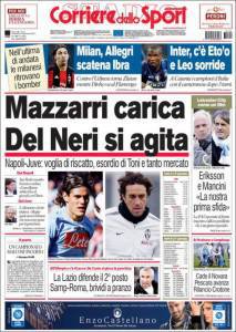 CORRIERE DELLO SPORT MAZZARRI DELNERI / L’edizione odierna de Corriere dello Sport si concentra sul bigmatch di questa sera tra Napoli e Juventu. Le due squadre sono entrambe reduci da una sconfitta ma, secondo il Corriere, Mazzarri, allenatore del Napoli, chiama alla carica i suoi; Delneri invece, allenatore dei Bianconeri, agita l’ambiente.